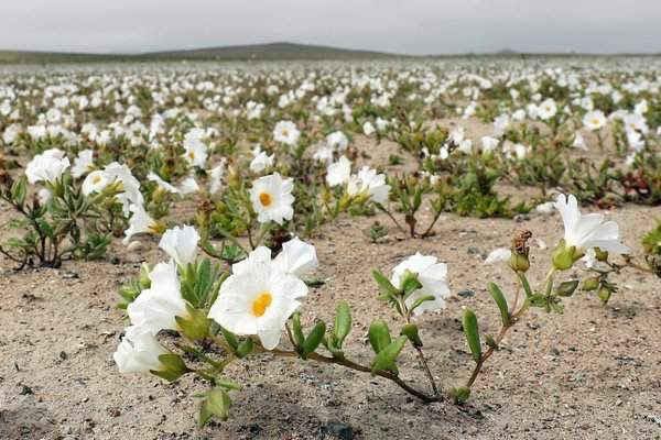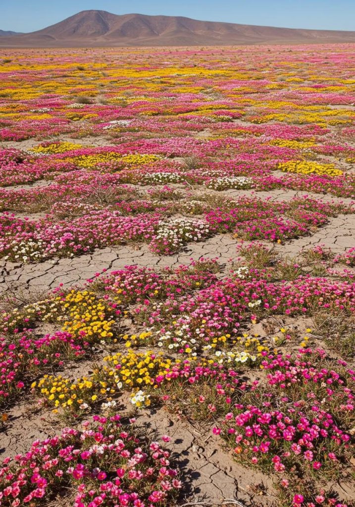 මෙසේ ලැබෙන සුළු වැස්සෙන් පසුව කාන්තාරයේ මල් පිපී ජීවය ලබන අයුරු මෙම ඡායාරූපවලින් දැක්වේ. 2024 වසරේදී අඟල් 0.4ක පමණ වැස්සක් ලැබීමෙන් දින දෙක තුනක් ඇතුළත විවිධ මල් වර්ග 20කට වඩා පිපී තිබෙනු එහි දැකගත හැකි විය. විද්යාඥයන් පවසන පරිදි, මෙම මල් වර්ගවල බීජ සුළඟින් පැතිරී කාන්තාරයේ තැන්පත් වී වැස්සක් බලාපොරොත්තුවෙන් වසර 10ක් වැනි කාලයක් පවතී. ඉතා සුළු තෙතමනයක් ලැබුණු වහාම මෙම බීජ පැළ වී, දින දෙක තුනක් ඇතුළත මල් හට ගනී. එම කෙටි කාලය තුළ කිලෝමීටර් සිය ගණනක් දුරට පැතිරී ඇති දම්, කහ, සුදු වැනි විවිධ වර්ණවලින් යුත් මල් පලසක් දැකගත හැකිය.